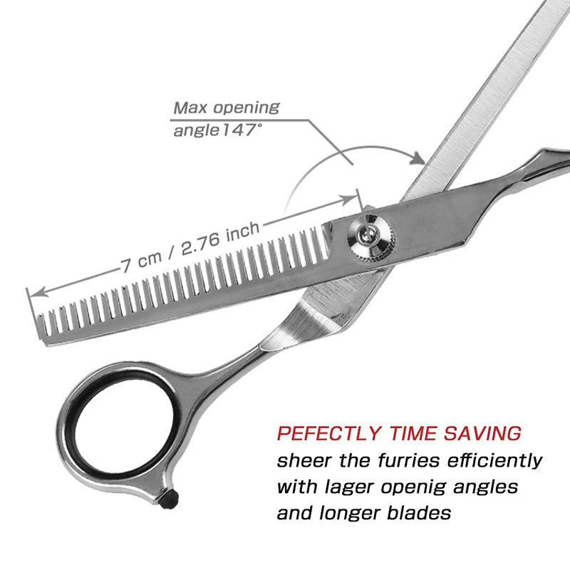 - 【 ADJUSTABLE AND SILENCER DESIGN 】 Pet grooming Scissors tool for dogs and cats. Can tightness of the blade can be adjusted by tightening or loosening the screw in the middle of the dog scissors according to the thickness of the pet hair for easy use. There is also a silencer pad on the handle, Can provide quiet grooming for your cats or dogs, which makes your pet will not be as scared as electric clippers.