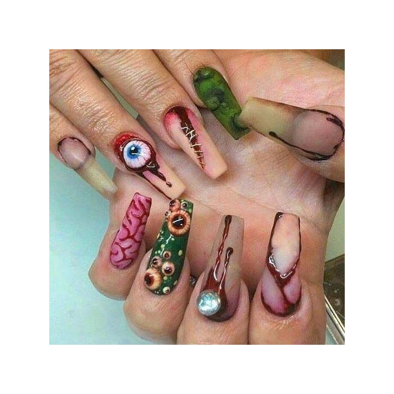 Chic Nail Studio Monster Mash Press-On Nails, Brain, Eyeball & Stitched Flesh Designs, 3D Gore Accents, Creepy Zombie-Inspired Base, Perfect for Scary Halloween Nights & Cosplay Fans.:_CUSTOM (IB SHOP)_Long Stilleto