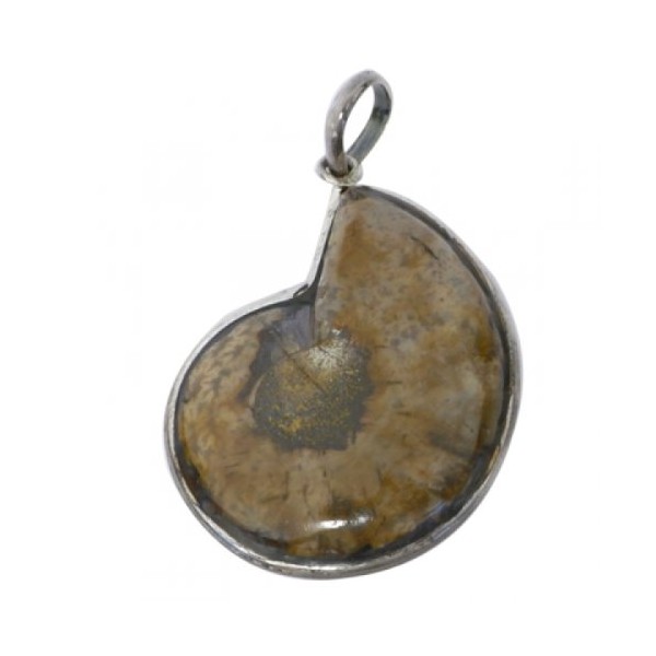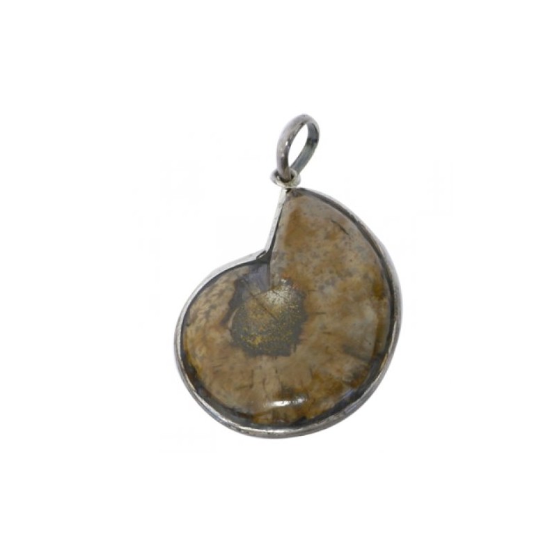 - This fossil nautilus shell is surrounded by 925 sterling silver, its back is open and filled with clear resin.