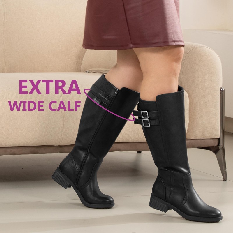 Chicblooms Women's Extra Wide Calf Stacked Buckle Hidden Stretch Block Heel Knee High Boots,Black PU,6.5 M US