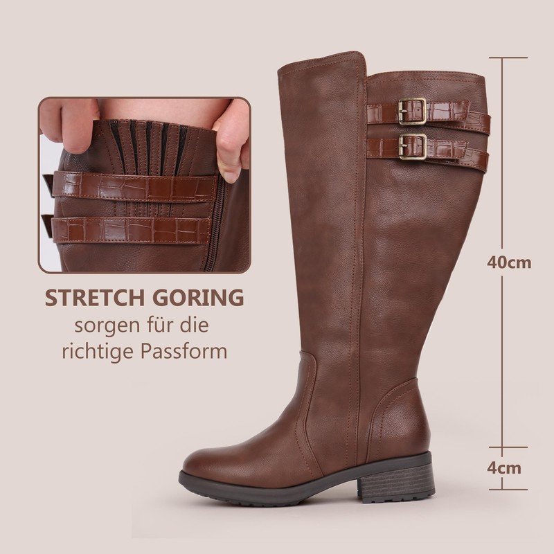 Chicblooms Womens Extra Wide Calf Block Heel Stacked Buckle Hidden Stretch Knee High Boots, brown
