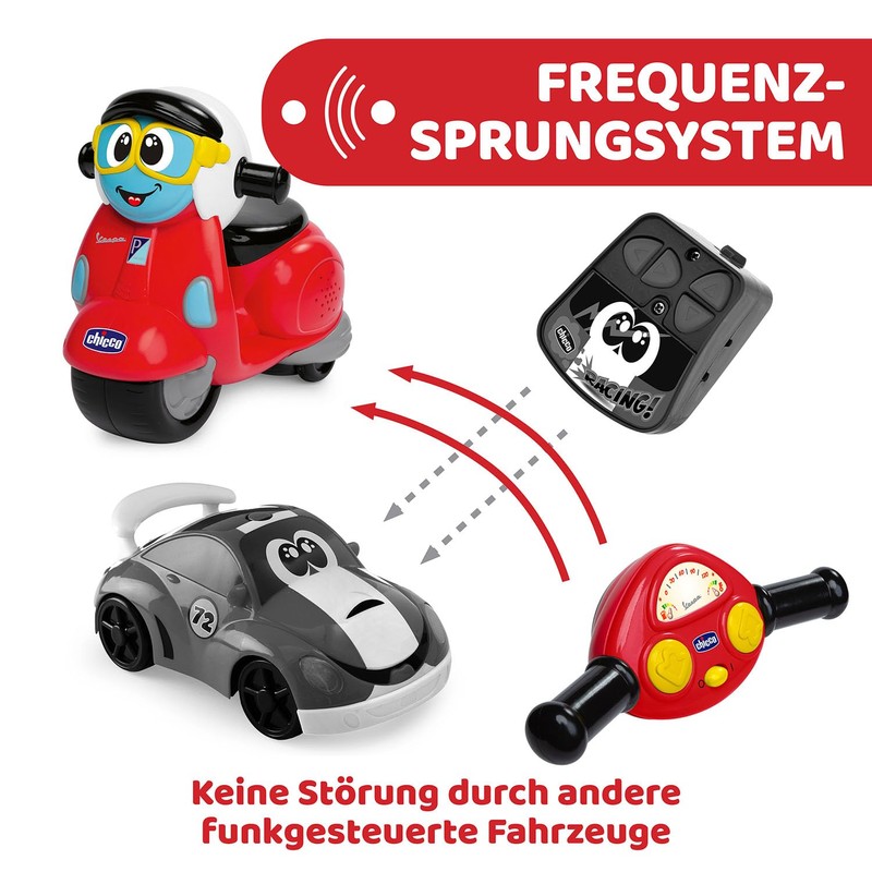 - Remote controlled motorcycle: Chicco's radio controlled motorcycle with original design licensed by the genuine Vespa Primavera; it moves in all directions and is equipped with a simple and intuitive steering system, with 2.4 GHz operating frequency
