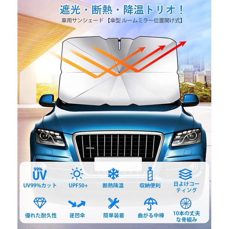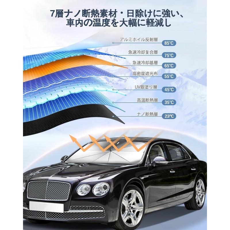 - (Excellent Durability & Cooling) This car sun shade uses an efficient composite titanium silver adhesive. Umbrella surface: Nylon, composite titanium silver adhesive. Effectively reduces the temperature of the car and prevents damage and aging; Umbrella rib: aluminum alloy, steel rib; Umbrella handle: ABS plastic. The sun shade blocks heat and reflects sunlight, effectively blocks 99.5% of UV rays, prevents interior deterioration. Reduces interior temperature, reduces air conditioner load and improves fuel economy. It will keep you cooler every time you park