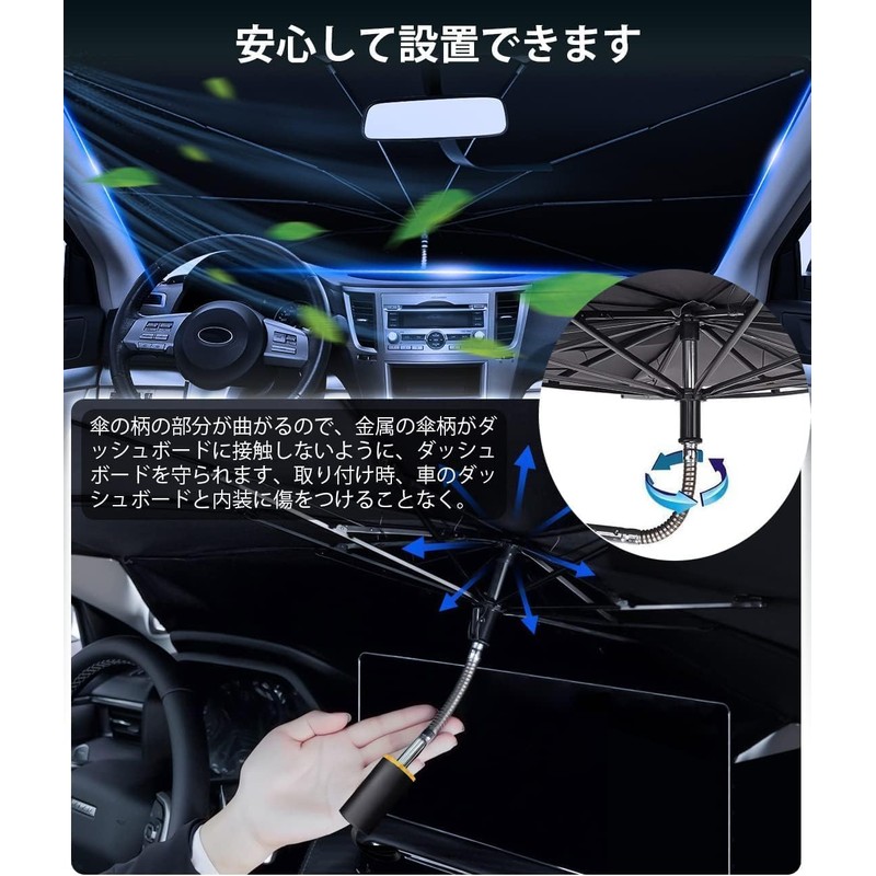 - (2025 Model) Features a unique design. The bendable umbrella handle and the high and low dashboard allows you to fold the umbrella handle to adjust. Protects your dash from friction to prevent metal umbrella from touching the dashboard. Install with confidence without damaging your vehicle's dashboard and interior It is easy for one person. When closed, you can put it in the storage bag and carry it without disturbing your drive. It can also be stored inside the side pocket of the door or glove box, so it is also recommended for cars with narrow car space