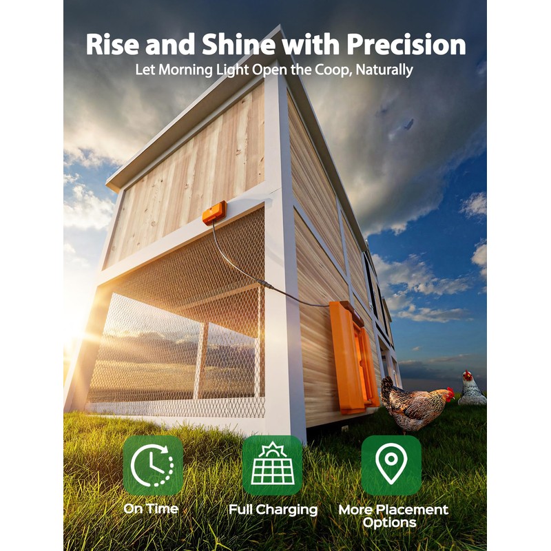 - ☀️SOLAR GRACE, ALWAYS ON - No outlets or batteries needed! Our high-efficiency ETTF solar panel (20.9% conversion rate) connects via weatherproof wiring to keep your auto chicken door running 365 days a year, rain or shine. With a 3200mAh battery, even cloudy days won't stop it. The UV-resistant, weatherproof design withstands corrosion and blazing sun—so you never have to babysit the power.