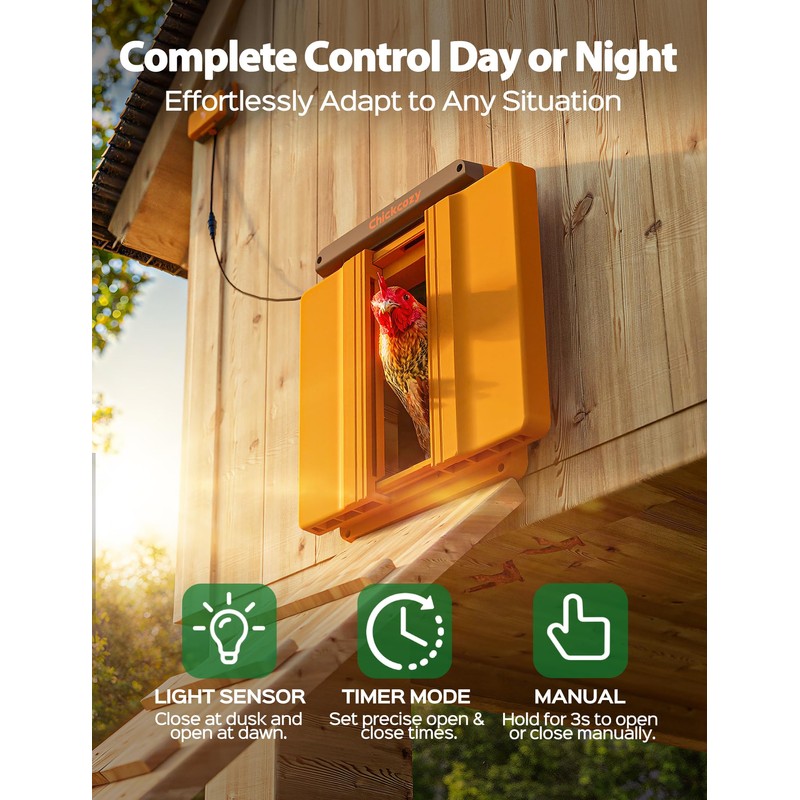 - 🌗TRIPLE MODE CONTROL - Command your coop with three precision modes: Timer Mode sets exact open/close times, Light Sensor Mode automatically opens at dawn and closes at dusk (light sensitivity adjustable), and Manual Mode activates with a long press—keeping your flock on their perfect natural rhythm with humane, stress-free operation.