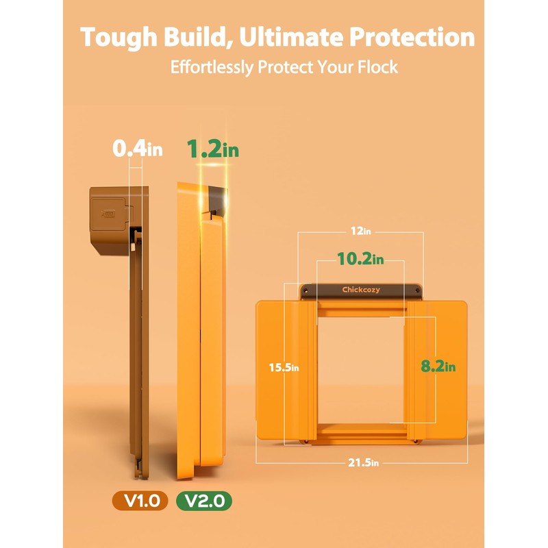 - ❄️BUILT FOR THE REAL OUTDOORS🔥 - 220% thicker! With high-strength ASA doors, it resists impacts, cracks, and warping. Works from -22℉ to 131℉ year-round. Track-free bottom prevents clogs, even in mud or snow. Fully sealed motor keeps running in heavy rain. Customizable light-sensor delay (as short as 3 minutes) stops false triggers while ensuring your flock greets the morning’s first rays, right on time. Tested 28,000+ times for daily reliability.