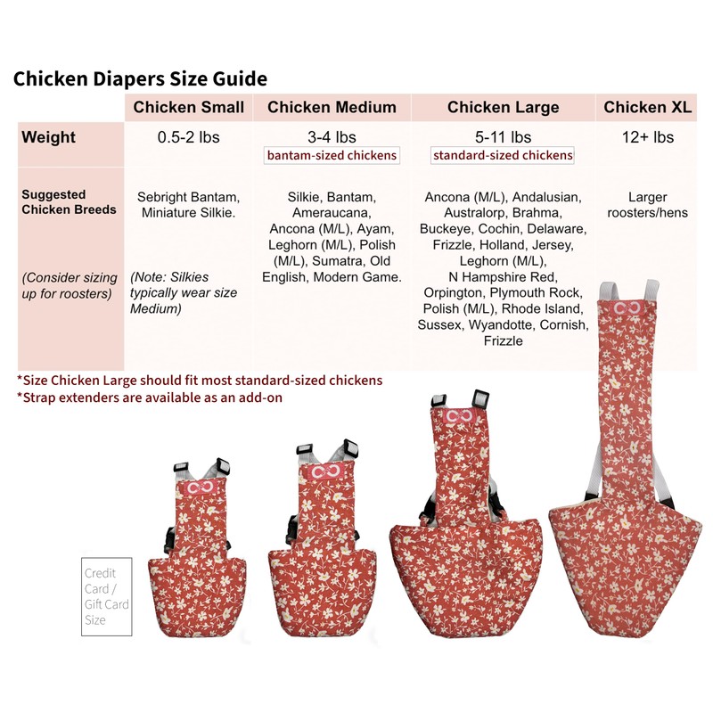 - Chicken diaper SIZE that FITS - ideal for bantam-sized chickens that weigh 3-4 lbs. These medium silky chicken diapers are ideal for the following chicken breeds: Standard Silkie, Ameraucana, Ancona, Ayam, Leghorn, Polish, Sumatra, Old English, Modern Game. These diapers for chickens are custom made - made by a chicken mom for chicken moms!