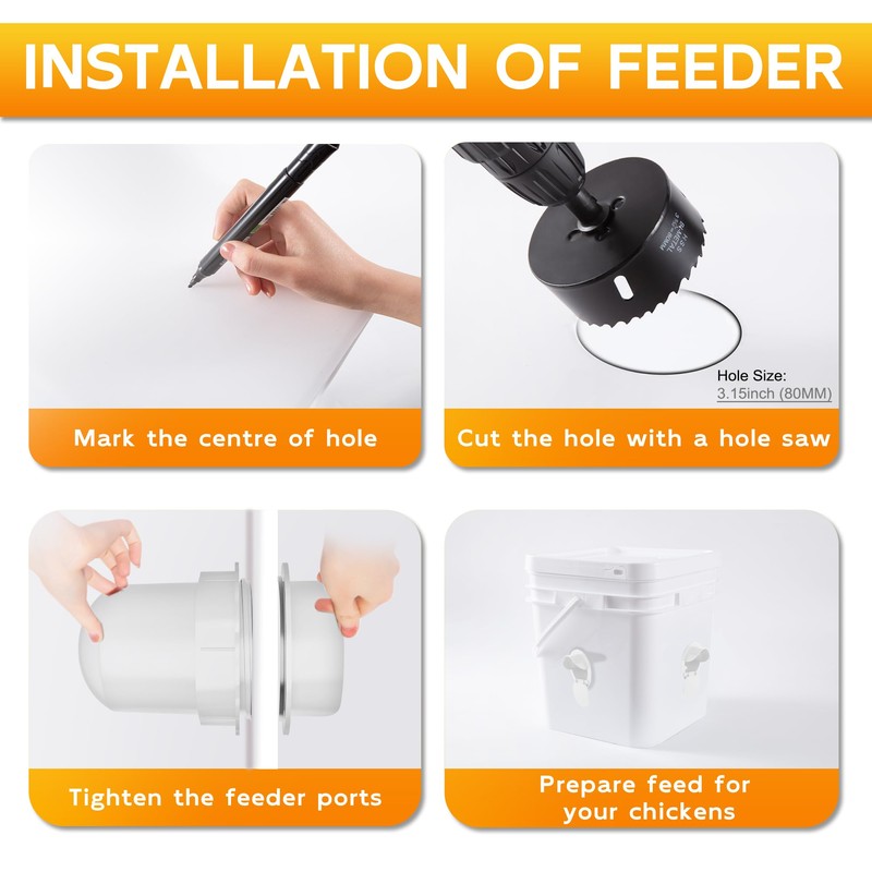- 🐥USE ANY CONTAINER: Compatible with various containers including troughs, buckets, barrels, boxes, and bins, the Hipykat Chicken Feeder is easy to install. All you need is a hole saw to create an automatic chicken feeder system. Place the container 6-10 inches above the ground for optimal accessibility.