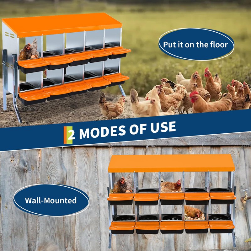 Chicken Nesting Boxes for Laying Eggs, 10 Compartment Roll Away Nest Box, Metal Wall Mounted Chicken Nesting Box with Ventilation, Easy Clean Hen Roosting Box,Chicken Coop Supplies,with Legs,Orange