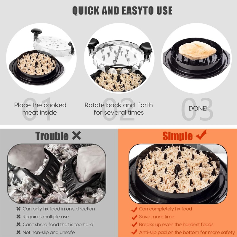 • High-Quality Material: Constructed from professional-grade ABS material, our Chicken Shredder Tool is built to last. It's lightweight, easy to maneuver, and features an easy-to-grip handle with a non-slip base for stability, enhancing your overall kitchen experience.