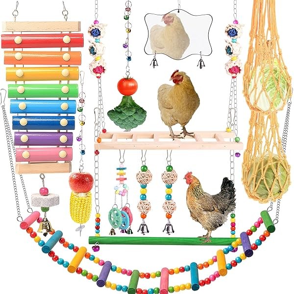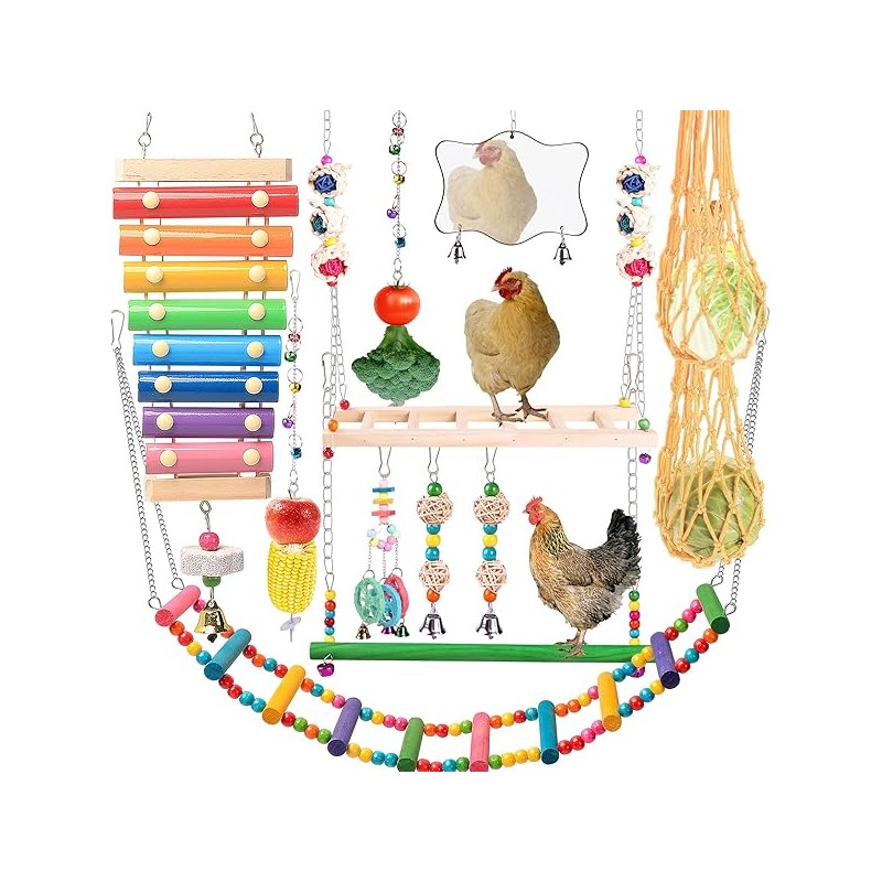 Chicken Toys for Coop 12PCS Set, Chicken Enrichment Toys,Including Xylophone, Swing Set, Mirror Toy, Flexible Ladder, Vegetable String Bag and Hanging Feeder, Coop Accessories for Hens