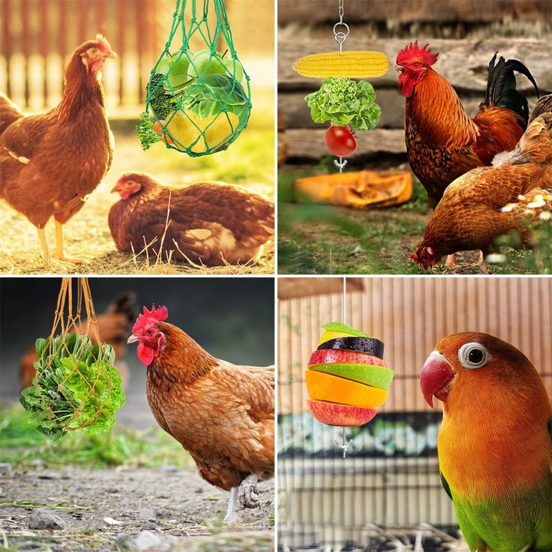 - 【What You Can Get】One package includes 2 pieces of hanging fruit feeder toys, 2 pieces of vegetable string bags in green and yellow and 2 pieces of stainless steel spring hooks. The chicken veggies forks with chains are made of stainless steel, anti-rust, sturdy and durable. These handy hen feeding tools are enough for your daily use and replacement.
