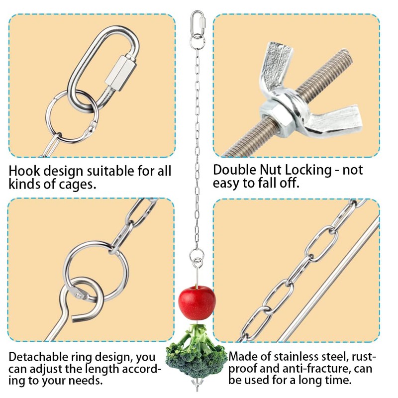 - 【Easy to use】The fruit skewer hanging feeder is very convenient to use, just unscrew the bottom screws, pierce vegetables and fruits into the stick, then tighten the screws and hang the vegetable fork in the proper place. And, adding shredding paper and bell block toys to provide more fun.
