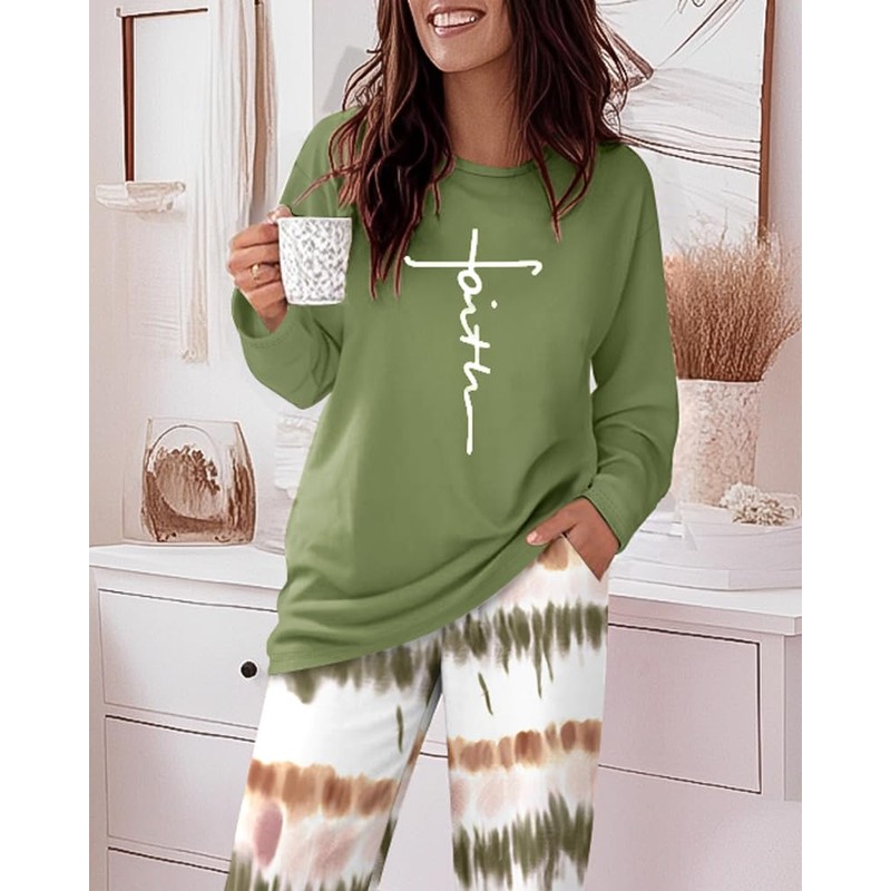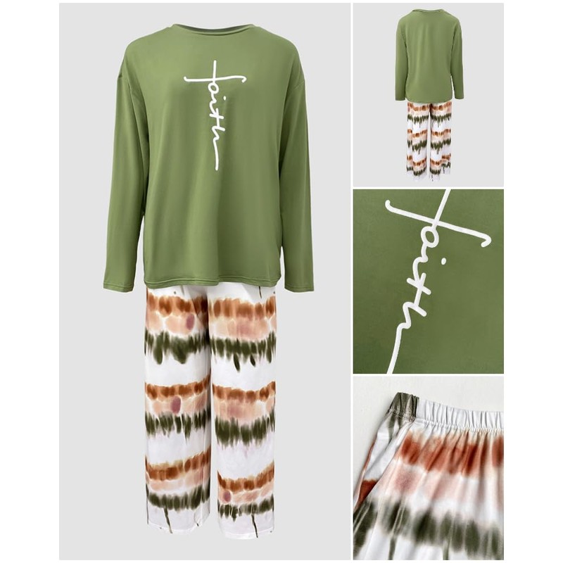 - Chic 2-Piece Pajama Set – This loungewear set includes a long sleeve round neck top and wide-leg printed pants, combining comfort with casual style for everyday relaxation