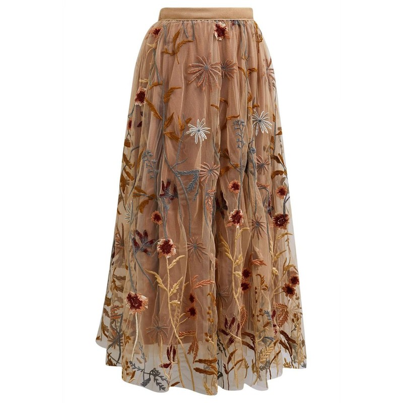 - [ Style Details ] Step into a fairytale with our Whimsical Flowers Embroidered Mesh Tulle Midi Skirt! Delicately adorned with intricate floral embroidery, this tulle skirt brings a dreamy, ethereal charm to any look. The flowing layers of mesh create a graceful silhouette that moves beautifully with every step. Whether for a special occasion or elevating your everyday style, this skirt adds a whimsical and romantic touch to your wardrobe.