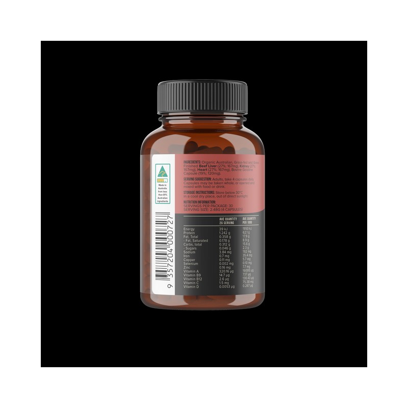 Put back the nutrients modern diets leave out with Beef Liver, Heart and Kidney; nutrient dense organ meats and a powerful source of vitamins and minerals essential for Immunity including Iron, Copper, Selenium, Zinc, Vitamin A, Vitamin B9 (Folate), Vitamin B12, Vitamin D and Vitamin C. Not many people like the taste of organ meats so this encapsulated product enables you to get the benefits without the taste!