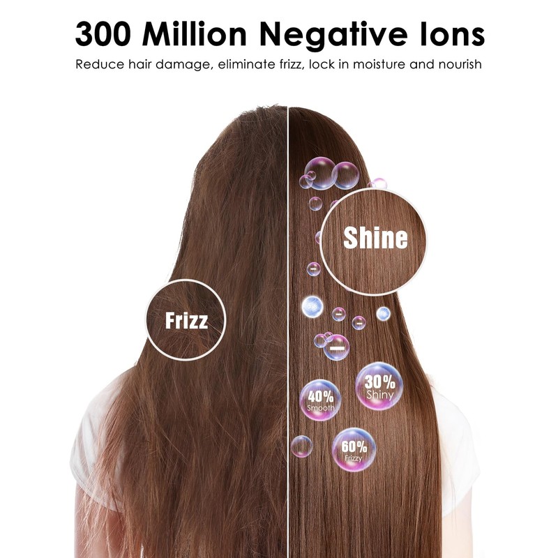 • ✨ 300 Million Negative Ions – Frizz-Free Shine & Hydration. Instantly neutralizes static and seals cuticles for smoother, shinier hair. Ideal for all textures—from straight to curly—locking in moisture without flyaways.