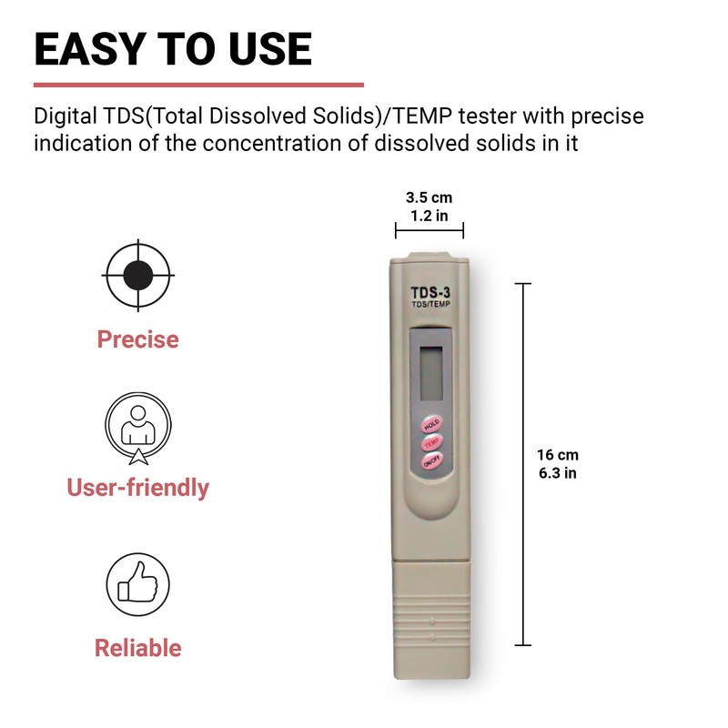 Are you concerned about the purity of your water? Look no further than our versatile and accurate Digital TDS Meter. With its cutting-edge technology and user-friendly design, it's an excellent tool for measuring Total Dissolved Solids and ensuring water quality. With our dissolved solids meter, you can easily and quickly assess the concentration of dissolved solids in your water. It measures conductivity, allowing you to estimate the TDS level accurately. Say goodbye to guesswork and hello to precise results! Designed to provide convenience and reliability, our digital water tester is incredibly easy to use. Simply immerse the probe into the water, and within seconds, the clear digital display will show you the TDS reading. No complicated setup or calibration is required – it's a straightforward process from start to finish. Not only does our TDS tester measure TDS levels, but it also doubles as a digital water tester. It's a multi-functional device that can be used as a ph tester for water as well. Now you can ensure both the purity and acidity of your water with a single tool. Whether you're testing the water in your fish tank, or hydroponic system, or simply evaluating the quality of drinking water, our TDS tester is the ideal companion. Its versatility knows no bounds, making it an essential tool for aquarium enthusiasts, gardeners, and anyone concerned about their water's quality. Ensure the quality of your water with our Easy-to-Use water TDS meter. Whether you're a fish tank enthusiast, a gardener, or simply concerned about the water you consume, our reliable and efficient water quality tester is here to help you make informed decisions about your water's purity.