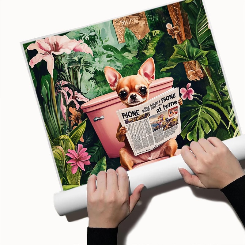 - Amusing Design: Features a chihuahua sitting on an open toilet reading a newspaper, adding a touch of humor and whimsy to your bathroom or toilet decor.