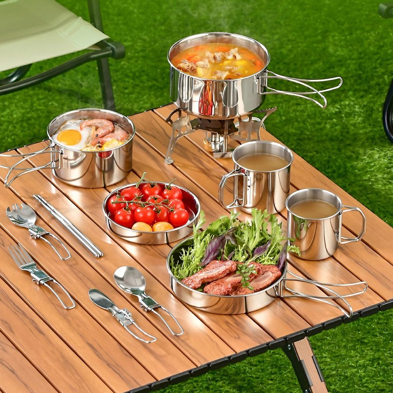 - Our stainless steel camping cookware set includes everything you need for outdoor dining adventures. It features a variety of pots, pans, utensils, and cutlery, allowing you to cook and enjoy a delicious meal in the great outdoors.