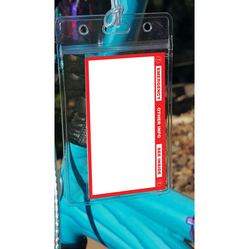 This tag is similar to a luggage tag, it is a folded information card that is printed on card stock. You write all your information on it such as child name, dob, medical conditions, allergies, parent contact information, pediatrician contact information, and whom to contact during an emergency. The card is then placed inside a waterproof holder and comes with a strong loop that can be attached to almost anything, just like a luggage tag would be attached to a device. These tags are much better than stickers, which could fade if the water is spilled on them, or rubbed off. These child emergency contact medical alert cards will last you.