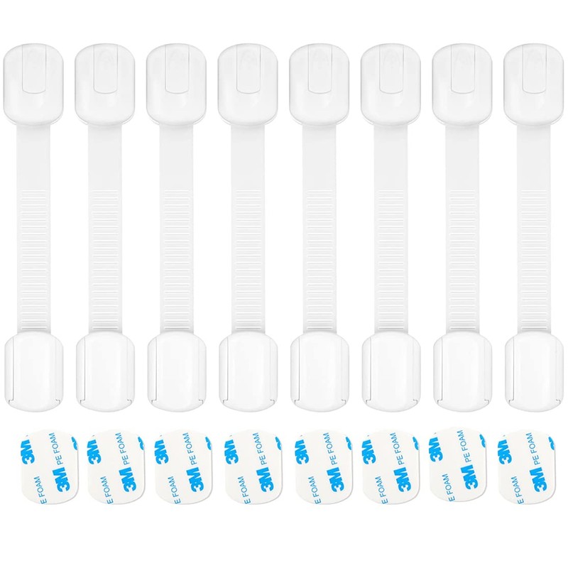 - 8 multi-purpose cabinet locks that has a high grade 3M adhesive. Flexible strap means you can bend around items from toilet seats to fridges.