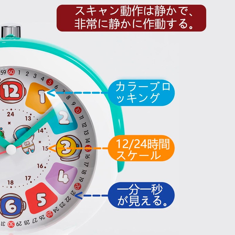 (Astronaut Design Educational Alarm Clock) The perfect learning aid gift for birthdays, children's days and school admission celebrations. The space-themed analog alarm clock is the perfect educational tool for studying watches, from toddlers to elementary school students. Large numbers and minute markers on the dial make it easy to read and learn the concept of time The pops of space themed images allow children to learn how to tell their watches naturally while engaging their interest. It also has an alarm clock function, so it is useful for creating daily routines. Rounded design for safety and easy access to children. Colorful hands and 60 second markers make it easy to read watch movement to help you develop a sense of time while playing. With a chalkboard bell and alarm sounds, it can be used both in the bedroom and on the study desk. When learning at night, the silent design reduces the needle noise, and the touch night light allows you to check the time even in the dark. As it grows, it can be used for a long time. The Astronaut Body is an educational watch that stimulates children's curiosity and makes a great birthday gift or advancement gift. A practical gift that develops self-ownership through learning how to read analog watches and promotes learning habits.