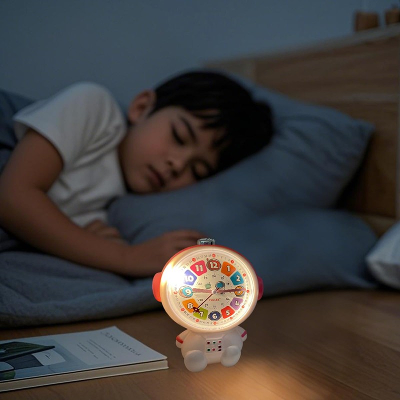Children Analog Learning Clock, Cute Astronaut Design, Silent, Alarm Clock with Dual Alarm & Night Light, Educational Learning for Elementary School Students, Easy to Read Analog Display, Tabletop,