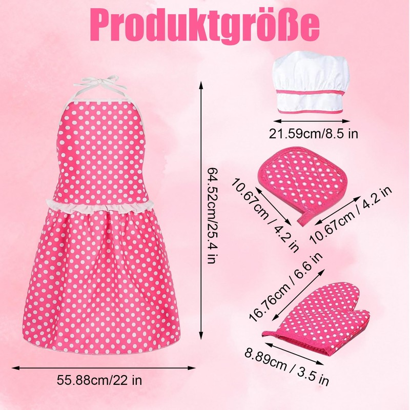 - Package content: you will receive 1 set cooking aprons for kids, including dress style apron, hat, gloves and pot holder, pink polka dot pattern design, beautiful and charming, it is a great gift for kids