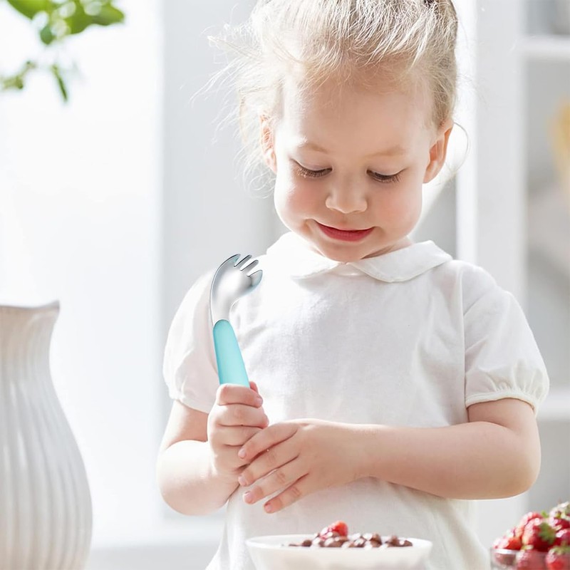 - COMFORTABLE DESIGN Curved spoon and fork for easy grip and improved hand-eye coordination, perfect for right-handed babies.