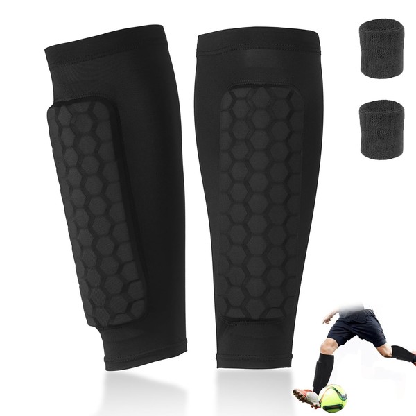 Children's Football Shin Pads, 1 Pair of Shin Pads, Children's Football and 1 Pair of Sweatband Wrists, Breathable and Non-Slip, Designed for Adolescent Football Players