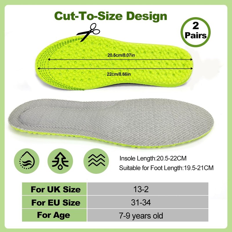 - Cuttable memory foam insoles: large insole length range 20.5-22 cm, suitable foot length range 19.5-21 cm, suitable European size 31-34, suitable age 7-9. Shoe insoles for too large shoes can be trimmed into different sizes to fit your children's shoes. Simply cut along the cutting guides to achieve the desired fit. And the adjustable insole can be used as a filler if the children's shoes are just a little too big.