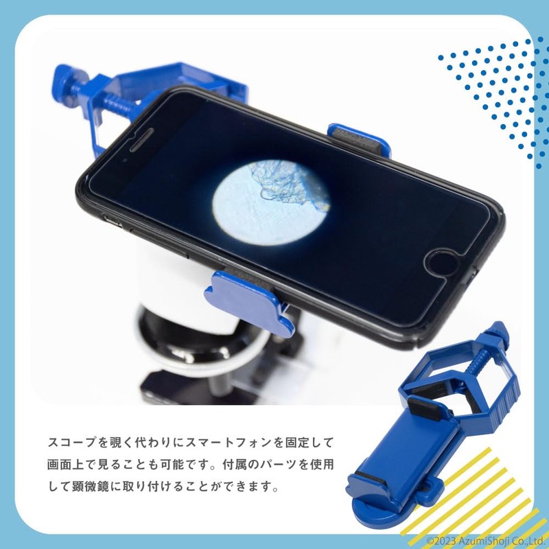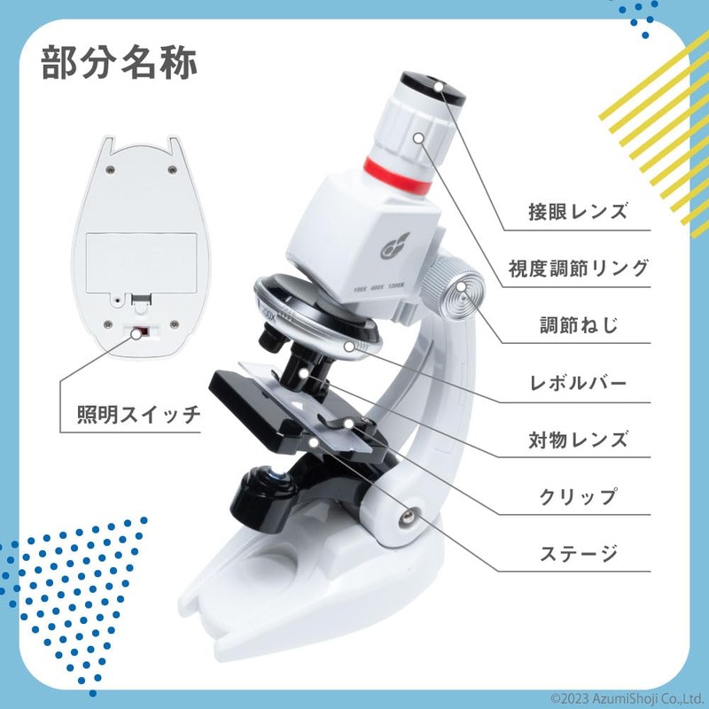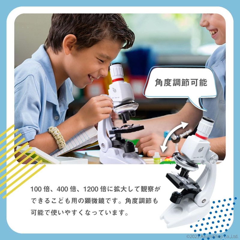 (100x - 1200x Microscope) Magnifying 100x, 400x, and 1200x magnification. The angle can be adjusted to 60° for easy viewing.