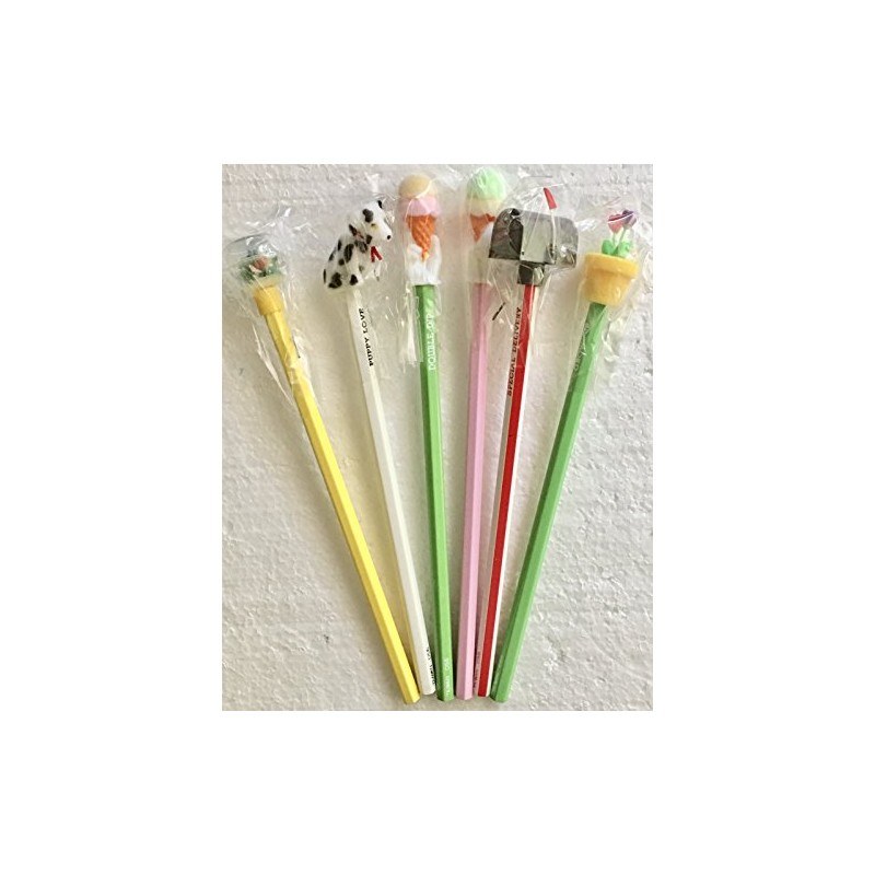 - A delightful, fun set of six (6) pencils with various toppers that stay on.