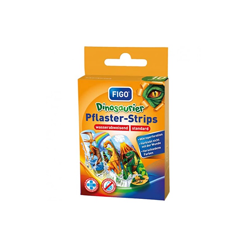 - Children's plaster dinosaurs. The plaster strips for small injuries with great child-friendly motifs. Micro-perforation elastic and stable. Does not stick to the wound. 10 pieces per package. Size: 56 x 18 mm