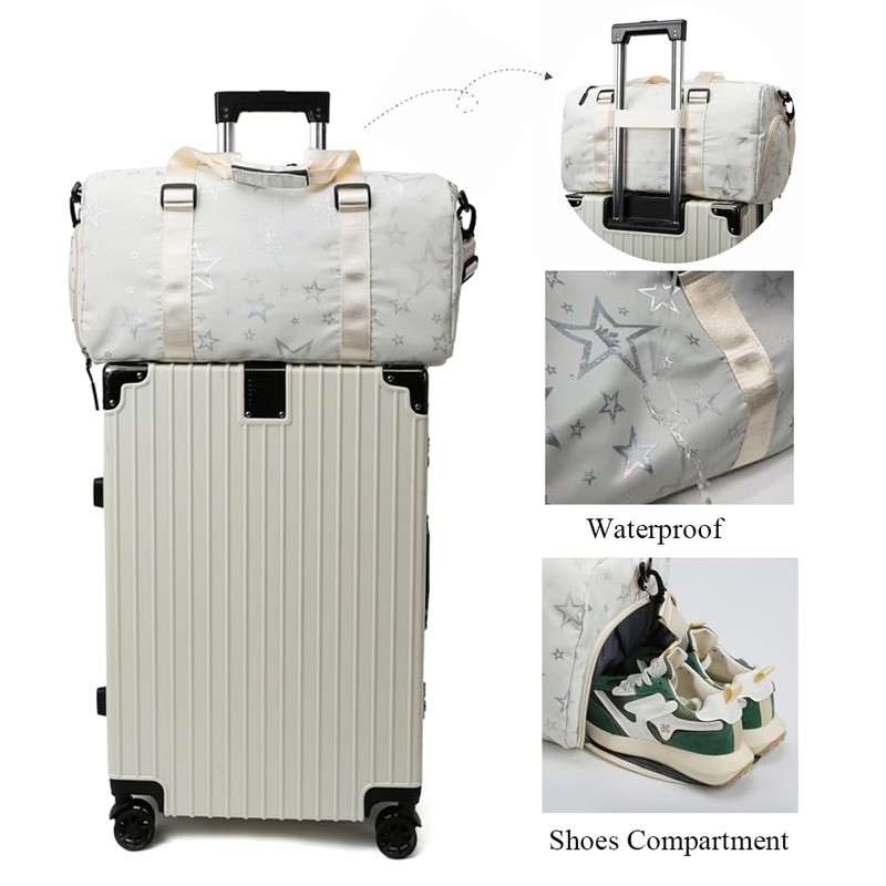 - ⭐️White star sports bag: size: 48cm(L) x 23cm(W) x 25cm(H); With the detachable and adjustable shoulder strap, the weight of this star travel bag is 0.4kg, large capacity for laptop, iPad, books, clothes, shoes, etc., it is very light, practical and suitable for travel, outdoor activities, camping, school, spring weekends and so on!