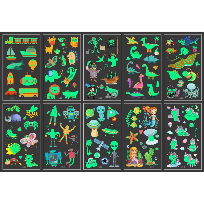 Children's Tattoo Set Girls Boys 10 Sheets Luminous Tattoos for Children, Waterproof Temporary Tattoos Space Mermaids Dinosaur Animals Unicorn etc., Children's Birthday Party Gift Decorations