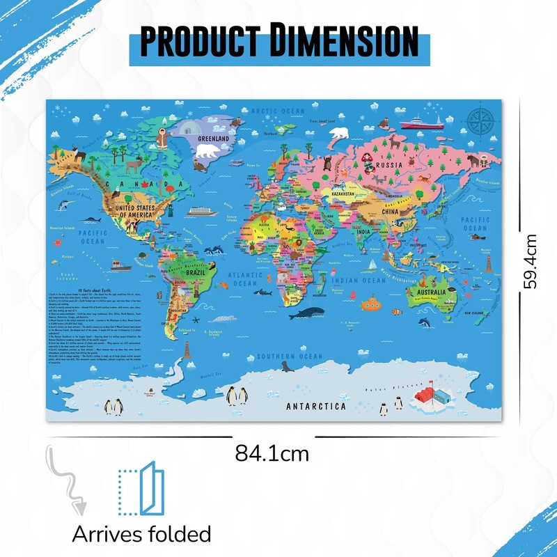 - Large A1 Size (841 x 594mm) – Perfect A1 children's world map size for bedrooms, playrooms, or classrooms, providing clear detail and colourful illustrations. Delivered folded for convenient storage and shipping, ready to be displayed as a large children's world map for wall.