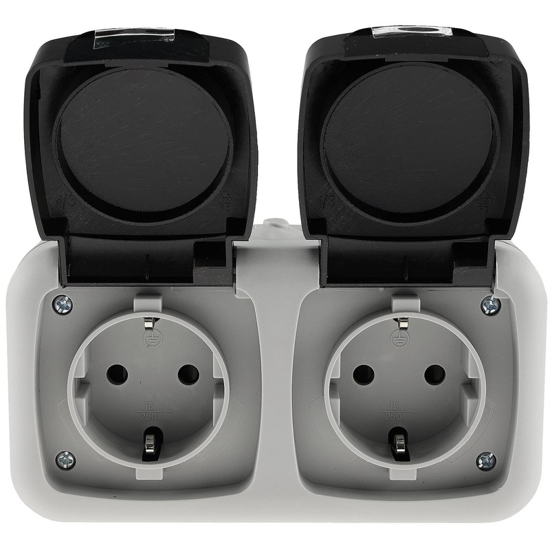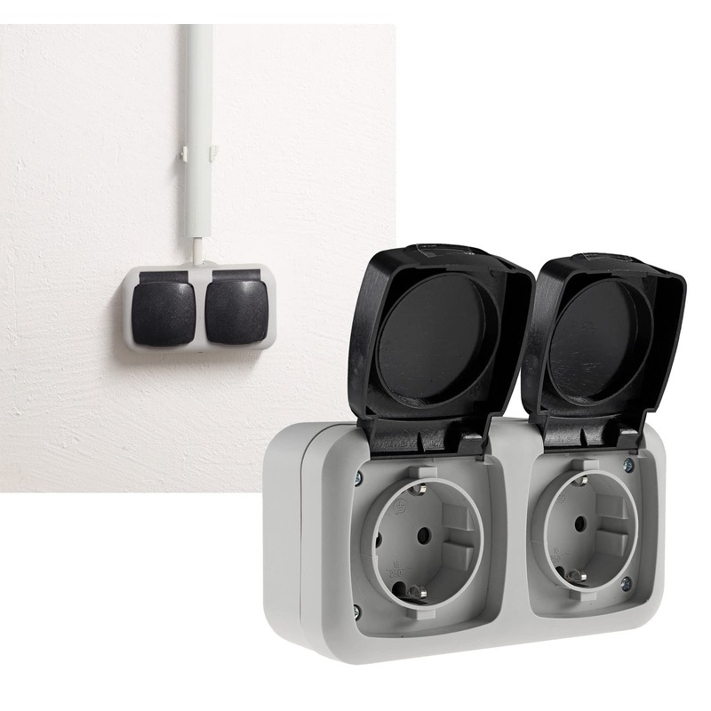 - Set of 3 wet room double sockets, pre-wired inside. 2-way surface-mounted socket for indoor and outdoor use.