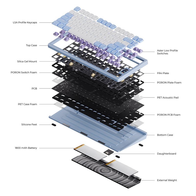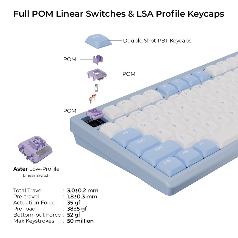 • Full POM Switch and Double Shot PBT Keycaps: Self-developed, our full POM switch delivers an effortless typing experience that’s combined with our high quality Double Shot PBT Keycaps