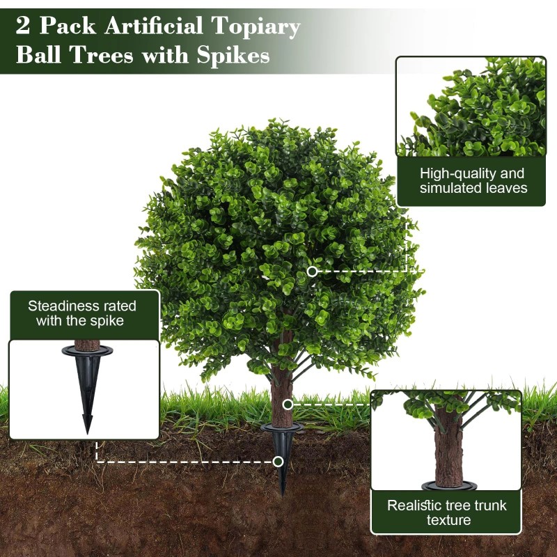 【EXCELLENT QUALITY】 The 2 pack of artificial boxwood topiary ball bushes with spikes for outdoor & indoor are made from premium material, designed to be UV resistant, waterproof, and fade proof. Size:22"H x 15"D x 15"W (Including the 4.7 inch height spikes). We have enhanced the density of the leaves making them look more lifelike and lush. The surface of the branches also has features realistic textures