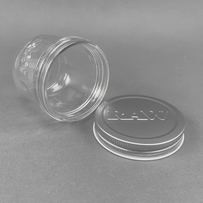- A preserving jar from RAW with a RAW 3D logo incorporated into the glass including metal lid. Measures approximately 8.2cm high x 9cm wide