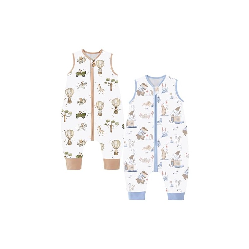 Chilsuessy 2er Pack Baby Schlafsack Sommer mit Füßen 0.5 Tog 100% Baumwolle Kinder Sommerschlafsack für Jungen und Mädchen, Blau Tiere + Heißluftballon, 80cm/Baby Höhe 90-100cm