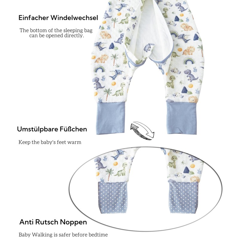- Sleeping bags with feet: make it easier for your baby to roll and move and allow a frog sleeping position. The extended foot design for turning over. Cover your baby's feet while sleeping or expose them while playing. Our design patent no: 008548143-0001, our sleeping bags have registered patents in the European Union for the appearance, shape and other functions.