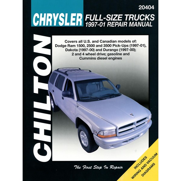 Chilton Chrysler Full-Size Trucks 1997-01 Repair Manual: Covers All U.S. and Canandian Models of : Dodge Ram 1500, 2500 and 3500 Pick-Ups (1997-01), Dakota (1997-00) and Durango (1997-00); 2 and 4 Wheel Drive; Gasoline and Cummins Diesel Engines