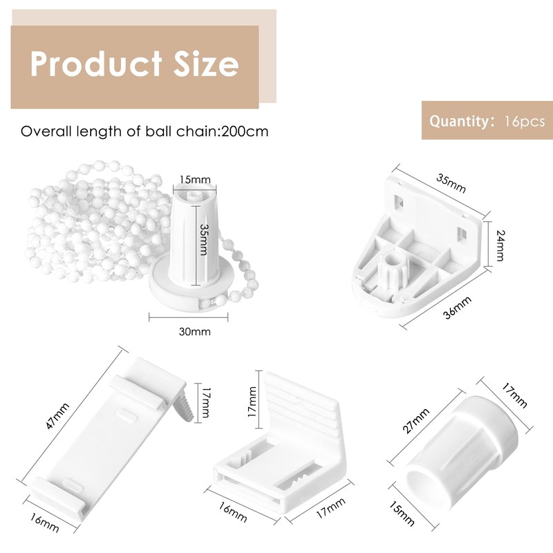 - Robust and durable: the pearl chain in the roller blind replacement parts is 200 cm long and ensures smooth operation without clogging during use. The brackets and accessories are carefully designed to ensure stability during use and not easy to fall off.