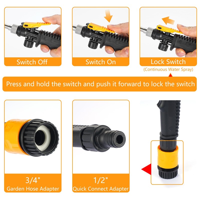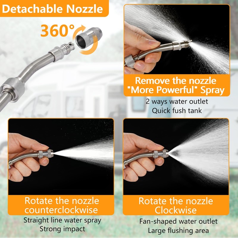 - Multifunctional Flusher: The metal rod for RV hot water flush wand is made of stainless steel and can be extended into the tank. When you turn the detachable nozzle counterclockwise and remove it, the washer can spray strong water in 4 directions to remove all dead corners in the water tank. The nozzle can also be rotated to change its spray volume to suit a variety of applications. It comes with a 1/2" quick coupling and 3/4" garden hose fitting for direct connection to the garden hose.