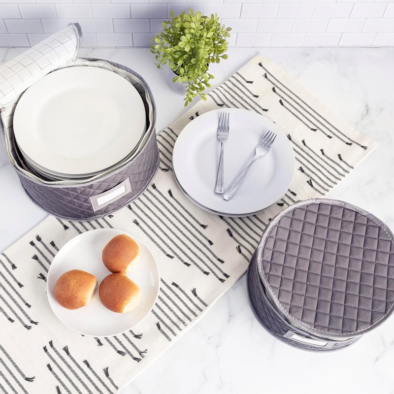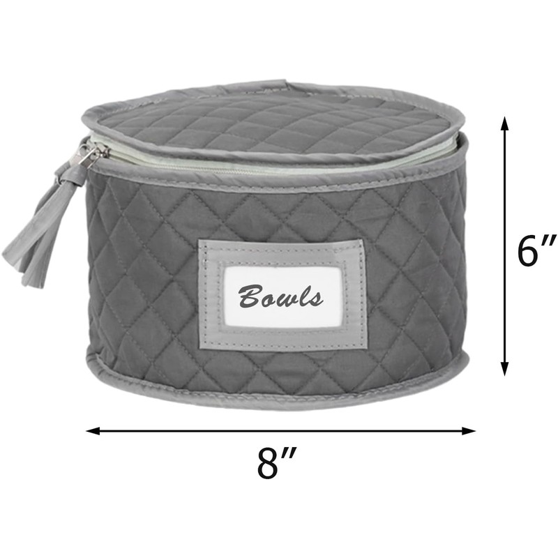 CONTENT: One plate case for small plates, 8" diameter by 6" height. It includes 12 felt plate separators for protection against chipping and scratching. PREMIUM MATERIAL: Made from Premium Polyester with non-slip texture with label holder and zippered closures. CARE: Hand wash with warm soapy water and lay flat to dry; or wipe with wet cloth as needed.