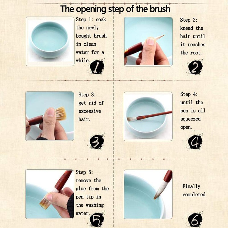 Chinese brush / Janapese brush / Calligraphy brush ❀1 Before each use, immerse in the water first for 3 minutes. Remove excess hair. Drain water and then dipping it in the ink. after use wash to remove the ink in the hair. ❀2 Don't put on cap after into water and ink. Place in the ventilated place after using, After the water dried,then put on cap. ❀3 This brush is handmade, 100% by hand from the beginning to the end. It's common for new handmade brushes to shed hair. After dozens of use, the shedding should stop . ❀4 Calligraphy is an intangible cultural heritage in china -- You can learn more chinese culture from the learning of calligraphy -- Chinese calligraphy practicing can help us calm, reduce working pressure, cultivate morality and optimize temper . ❀5 Package includes: 6 pcs chinese brush.